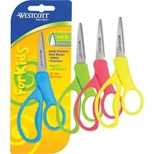 Children's scissors are designed for left-handed or right-handed use. Pointed tip is perfect for detailed cutting tasks. Blades are made of rust-resistant stainless steel, and straight handles are made of plastic.