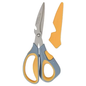 Multipurpose shears feature titanium-bonded blades that are three times harder than steel to keep a lasting sharp edge. Built-in box opener is easy to use for a safe alternative to box cutters. Integrated bottle opener quickly opens your favorite beverage with ease. Included protective sheath prevents the blades from dulling when stored.