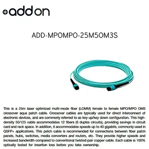 Addon ADD-MPOMPO-25M5OM3S THIS IS A 25M MPO (FEMALE) TO MPO (FEMALE) 12-STRAND AQUA STRAIGHT RISER-RATED F