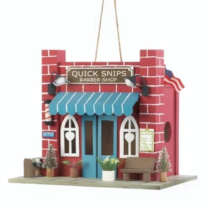Transform your outdoor space with this charming barber shop birdhouse! Designed to attract feathered friends, this unique birdhouse features a whimsical brick facade, blue double doors, and a delightful awning. With added greenery and a cozy bench outside, it offers a perfect home for birds while enhancing your garden's aesthetic.