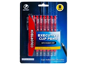 Explore creativity and organization with the Executive 8 Pack Click Pens featuring a comfortable rubber grip. Ideal for school, home, or office use, these retractable pens allow you to jot down ideas effortlessly. Each pen is equipped with a cap that indicates the ink color and a fine point for smooth, quick-drying writing. Packaged in a convenient hanging blister pack, they are perfect for any writing task.