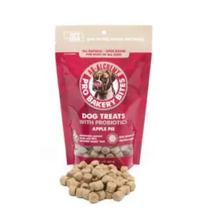 Pro Bakery Bites are delicious apple-flavored crunchy treats designed to support your pet's health. Made from 80% upcycled ingredients, these bites are not only tasty but also beneficial for digestive wellness.