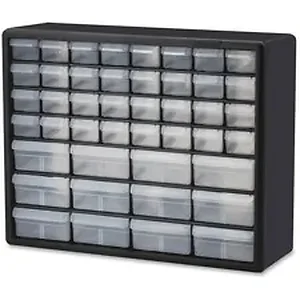 Strong plastic cabinet organizes and protects your small supplies and other components. Cabinets stack securely and can also be wall-mounted with keyhole slots. This stackable cabinet includes 26 large and small dividable drawers to multiply storage options. Clear unbreakable drawers offer easy content identification. Finger-grip drawer pulls provide easy access, and rear stop tabs prevent contents from spilling. Frame is made of one-piece, high-impact plastic. Dividers are molded into the back of the cabinet.