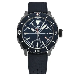 Alpina AL247LNN4TV6 Men's 'Seastrong Diver' GMT Blue Dial Blue Rubber Quartz Watch Alpina AL247LNN4TV6 Men's 'Seastrong Diver' GMT Blue Dial Blue Rubber Quartz Watch includes case, box, paperwork and 30 days return. The Alpina AL247LNN4TV6 Men's 'Seastrong Diver' GMT Blue Dial Blue Rubber Quartz Watch features a stainless steel 47mm case, with a stationary bezel, a blue dial and a sapphire crystal. The 22mm rubber band is fitted with tang clasp. This beautiful wristwatch, powered by a quartz movement. This watch has a water resistance of up to 300 meters, suitable for recreational surfing, swimming, snorkeling, sailing and water sports. Features: Brand: Alpina Model number: AL247LNN4TV6 Case Shape: Round Dial window material type: Sapphire Display Type: Analog Clasp: Tang Case material: Stainless steel Case diameter: 47 millimeters Case Thickness: 13 millimeters Band Material: Rubber Band length: 8 inches Band Width: 22 millimeters Band Color: Blue Dial color: Blue Bezel material: Stainless steel Bezel function: Stationary Special Features: Glow in the Dark Calendar: Date window at 3 o'clock Movement: Quartz Water resistant depth: 300 meters UPC: 7688200305601 Alpina AL247LNN4TV6 MSRP: $795