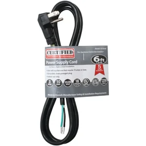 This 6-foot power supply cord features a 90-degree plug that fits flush against the wall, making it ideal for tight spaces. It is designed to provide reliable power with a 10-amp, 125-volt rating, ensuring safe and efficient operation of your appliances.
