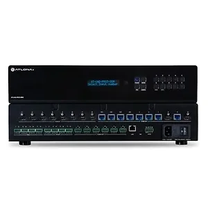 The AT-UHD-PRO3-88M is a dual-distance 4K/UHD 8 8 HDMI to HDBaseT matrix switcher 4K/UHD at 60 Hz video signals with Power over Ethernet for receivers and analog audio breakout. The matrix provides flexible HDBaseT routing with both extended distance, 330 foot (100 meter) and long distance, 230 foot (70 meter) transmission over category cable with bidirectional extension of both RS- 232 and IR Control. Two HDMI outputs are provided as mirrored outputs designed for routing HDMI-based audio to an AVR or as additional matrix outputs. The matrix switcher is HDCP 2.2 compliant and supports EDID communication. The matrix is control system-friendly and integrates with any TCP/IP, RS-232, or IR based control signals. Use with optional AT-IR-CS-TX IR emitter cable for AV system control. Designed for multi-zone residential or commercial distribution applications, the PRO3-88M features a 2U, rack-mountable enclosure with internal, international power supply.