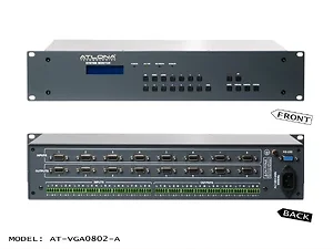 The Atlona AT-VGA0802-A is a state-of-the-art 8x2 VGA matrix switcher designed for commercial applications. It allows for seamless switching between multiple VGA sources and outputs to two displays, making it ideal for presentations, classrooms, and other professional environments.