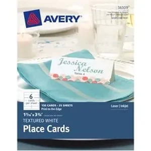 Add an elegant, personalized touch to parties, events, meetings and celebrations with personalized place cards. The textured, heavyweight cardstock stands up to frequent folding, making them perfect for use as place cards, on buffets, or as product description cards at boutiques, trade shows or farmers markets. Personalize and print with free online designs and templates using your laser or inkjet printer. Bright vibrant colors and sharp, clear text can be printed to the edge on both sides for a polished, professional look that will add a special feel to any event. Each sheet includes six uncoated, perforated cards (1-7/16" x 3-3/4").