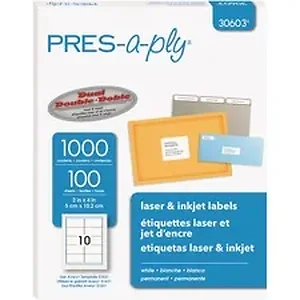 <div><b>General Information</b><hr/><span>Manufacturer</span>:Avery<br/><span>Manufacturer Part Number</span>:30603<br/><span>Manufacturer Website Address</span>:http://www.avery.com<br/><span>Brand Name</span>:PRES-a-ply<br/><span>Product Name</span>:PRES-a-ply White Labels<br/><span>Marketing Information</span>:<p>Standard shipping labels offer printing convenience and permanent adhesive. They are great for high-volume, low-cost printing. Letter-size sheets automatically feed from paper tray of your laser and inkjet printers.</p><br/><span>Packaged Quantity</span>:1000 / Box<br/><span>Product Type</span>:Shipping Label<br/></div><div><b>Product Information</b><hr/><span>Number of Sheets</span>:100<br/><span>Number of Labels per Sheet</span>:10<br/><span>Total Number of Labels</span>:1000<br/><span>Adhesive Type</span>:Permanent<br/><span>Shape</span>:Rectangle<br/><span>Print Technology</span>:<ul><li>Laser</li><li>Inkjet</li></ul><br/><span>Finishing</span>:Matte<br/><span>Features</span>:Permanent Adhesive<br/></div><div><b>Physical Characteristics</b><hr/><span>Color</span>:White<br/><span>Material</span>:Paper<br/></div><div><b>Miscellaneous</b><hr/><span>Environmentally Friendly</span>:Yes<br/><span>Environmental Certification</span>:FSC Mix<br/><span>Country of Origin</span>:Canada/Mexico<br/></div>
