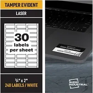 PermaTrack Tamper-Evident Asset Tag Labels make it easy to create your own asset tags, bar-code labels, equipment tags, property tags and nameplates on demand, right from your laser printer. Allow 24 hours for the labels to set, and once lifted, these labels leave behind a checkered-pattern layer and cannot be reapplied, discouraging theft, tampering or warranty fraud. Chemical-resistant, tear-resistant and waterproof, these asset tags print smoothly without skewing or jamming. Use the free, online, Avery Design & Print software with bar-code generator to add text, graphics, serialized numbers or bar codes in just a few steps. Then print as many asset tags as you need when you need them, avoiding high minimum order quantities and long lead times from custom printing services. Tamper-Evident Asset Tags feature a strong adhesive to enable reliable identification and tracking for the life span of your asset. Each letter-size sheet includes 30 labels (3/4" x 2").
