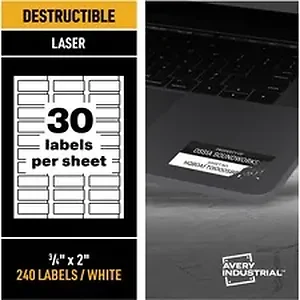 PermaTrack Destructible Asset Tag Labels make it easy to create your own asset tags, bar-code labels, equipment tags, property tags and nameplates on demand, right from your laser printer. Allow 24 hours for the labels to set, and once lifted, these labels will break into pieces when someone attempts to remove them, discouraging theft, tampering or warranty fraud. Chemical-resistant, tear-resistant and waterproof, these asset tags print smoothly without skewing or jamming. Use the free, online, Avery Design & Print software with bar-code generator to add text, graphics, serialized numbers or bar codes in just a few steps. Then print as many asset tags as you need when you need them, avoiding high minimum order quantities and long lead times from custom printing services. Destructible Asset Tags feature a strong adhesive to enable reliable identification and tracking for the life span of your asset. Each letter-size sheet includes 30 labels (3/4" x 2").