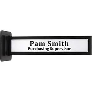 Wall-mount sign features a dimensional design that adds depth to your name to ensure it can be easily seen from multiple directions. Pop out construction folds out from the wall for complete visibility from either side. A self-adhesive backing on the bracket allows quick, simple installation in an optimal location without the need for additional tools. Plus, the translucent plastic cover reduces glare and protects your nameplate to maintain its professional appearance. Sign is designed for use with 8-1/4" x 1-3/8" inserts.