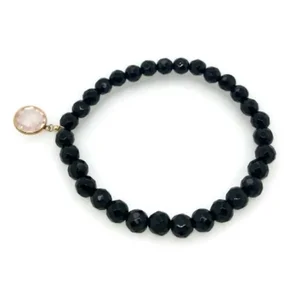 This stunning bracelet showcases a beautiful combination of genuine black onyx and rose quartz. The faceted black onyx beads are expertly paired with a delicate rose quartz charm, all enhanced by a luxurious 14k gold bezelled finish. Perfect for any occasion, this bracelet effortlessly transitions from day to night, adding a touch of sophistication to your style.