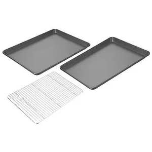 Upgrade your baking experience with the Chicago Metallic Non-Stick Bakeware Set. This versatile 3-piece set includes two jelly roll pans and a cooling grid, perfect for all your baking needs.