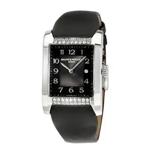 The Baume & Mercier Women's Hampton Milleis Opaline Black Dial Quartz Watch combines elegance with luxurious design. This exquisite timepiece features a uniquely shaped rectangular stainless steel case with a brushed and polished finish, adorned with 36 diamonds totaling approximately 0.73 carats. The opaline black dial showcases a fine sunray finished anthracite/grey center, providing a striking contrast. It is powered by reliable quartz movement and is water-resistant up to 50 meters, making it both a stunning accessory and a practical watch.