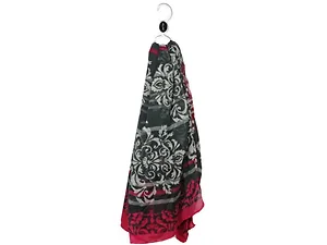 The scarf showcases a stunning black background adorned with a sophisticated white damask print, complemented by a vibrant hot pink and black border. It measures approximately 38" x 75" and comes conveniently packaged on a plastic hanger with a hangtag.