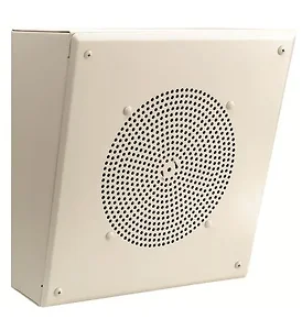 Available with a 12.5° angled front for optimal sound direction, this self-contained speaker also interfaces easily with standard 600-ohm telephone lines. The installation is hassle-free, with knockouts for Wiremold and included mounting hardware (toggle bolts, wood screws, pluggable screw terminals, and the volume knob).
