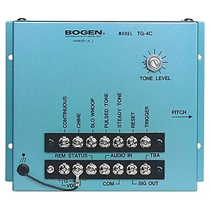 - 4 types of tones: steady, pulsed alarm, slow whoop, and chime- Tones triggered by external contact closure (momentary or long duration)- Choice of continuous generation of tones or two-burst operation (except for steady tone)- External audio signal can pass through TG4C and is suppressed during tone generation- Adjustable tone level and pitch- 600-ohm output