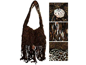 Constructed from a blend of brown and black yarn, the interior is lined with luxurious giraffe print velvet. Notable details include a secure zip closure, playful fringe adorned with bohemian-style beads, and a decorative stone on the front flap. Measuring approximately 12 inches wide and 8 inches tall, with straps that are 7 inches long, this bag combines function with style. The stunning stone detail measures 2 1/4 inches in diameter.
