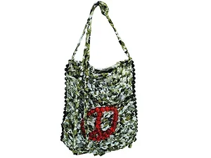 This stylish cross-body bag is perfect for day trips or casual evenings out. Its compact size makes it easy to carry your essentials like a camera, phone, wallet, and keys! Crafted from soft knitted camouflage cotton strips, the bag features a vibrant red plastic peace sign on the front and black plastic beads delicately sewn along the sides.