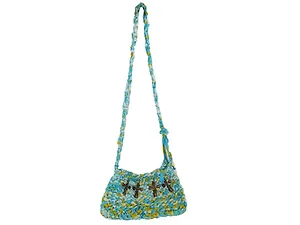 This vibrant bag is crafted from a combination of shredded turquoise and lime green cotton, ensuring both durability and flair. The interior is lined with a matching turquoise fabric and features a secure zipper closure to keep your items safe. The front is adorned with four stylish brass crucifixes, adding a chic touch to your outfit.