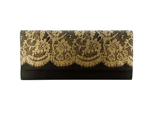Add a touch of elegance to your outfit with this stunning Elegant Lace Print Clutch Bag. Crafted from luxurious satiny black material, it features a glittery gold lace print on the flap that adds a sophisticated flair. The satiny gold interior provides ample space for your essentials, while the secure snap closure keeps your belongings safe.