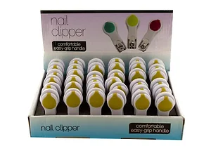 Introducing the Easy-Grip Nail Clipper, designed to make nail grooming a breeze. The comfortable handle features a soft, textured center, providing a secure grip for effortless clipping. Crafted from durable metal with robust plastic handles, these clippers are built to last. Each clipper measures approximately 2.75" x 1" x 0.5", making them a perfect size for precise trimming. This counter top display includes 36 clippers, ideal for retail or personal use.