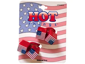 Add a festive touch to your hairstyle with our Red, White, and Blue Cubes Ponytail Holders Set. This 2-Piece set features vibrant red plastic cubes adorned with printed American flags, perfect for patriotic occasions. The cubes are securely attached to stretchy red ponytail holders, making them ideal for all hair types. Each set comes neatly packaged on a hanging panel for easy presentation.
