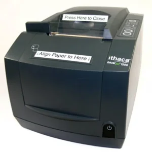 The Ithaca Bankjet 1500 is a high-performance monochrome ink-jet printer designed specifically for printing high-quality bank and identification documents. With its sleek dark gray design, this printer seamlessly fits into any workspace while delivering reliable and consistent results.