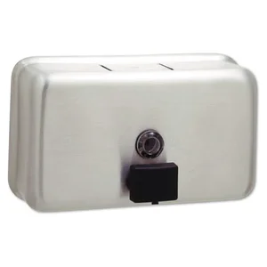 Surface-mounted, horizontal soap dispenser features a satin-finish, stainless steel construction to resist being vandalized or damaged for long-lasting performance. The hinged, filler-top requires a special key to open to prevent unauthorized access to the compartment. Soap refill window lets you quickly monitor the current fill level to prevent unexpected soap depletion. Concealed design fastens to walls without showing any unsightly parts to blend seamlessly into the room. Soap dispenser is designed for use with all-purpose, liquid soaps (sold separately).