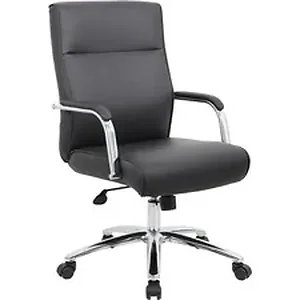 The Modern Executive Conference Chair features CaressoftPlus upholstery to give you an ultra-soft seat that's both breathable and durable. This trademarked vinyl looks and feels like leather yet cleans easily with just a damp cloth. Spring-tilt mechanism allows you to change the angle of the entire seat relative to the floor and to transfer some of your upper body weight to the backrest of the chair. The 27" chrome base offers extra stability to the chair by spreading the load over a larger surface area to help prevent tipping. Pneumatic gas lift allows easy seat-height adjustments to help you find the personalized sitting style that suits you and your work environment. Padded, stationary loop arms are ergonomically shaped for comfort and extended use. Hooded, double-wheel casters slide smoothly on floors to make it easy to move and shift directions. Executive chair supports up to 275 lb.