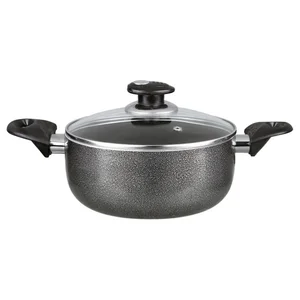 Prepare delicious family meals with the Brentwood 3 Qt. Aluminum Dutch Oven in an elegant gray finish. Its non-stick coated interior promotes healthier cooking by requiring minimal fat, while the food effortlessly slides out for easy serving and cleaning. The pot features Bakelite handles that remain cool to the touch to prevent burns and scalds, ensuring safe handling. Additionally, the vented tempered glass lid allows you to monitor your cooking process without lifting the cover.