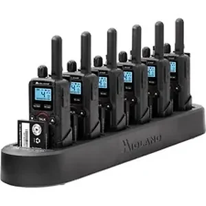 Two-Way Business Radio is lightweight yet provides clean, clear communication. The 1-watt transmitter has enough power to provide crystal-clear communication without overpowering your neighbors. Battery stays charged up to 14 hours and alerts you when your battery is low. Features include 142 privacy codes, NOAA Weather Alert and battery save mode. Keypad lock keeps your radio protected from accidental button pushing. Radio-to-radio mode allows you to easily communicate without rebinding to receiver. LCD screen displays easy-to-read radio information. Call tones signal to others that you want to talk. Vibrating alerts provide important weather or hazard updates. Included charger powers up to six radios from a single AC outlet. Radio rapidly recharges to quickly use again.