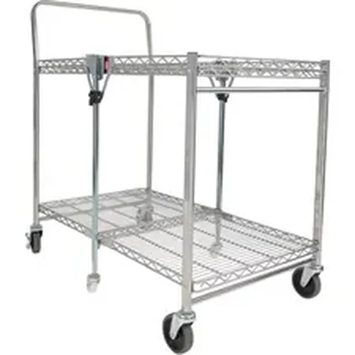 Utility cart features a heavy-duty, chrome-plated construction with a maximum capacity of 500 lb. to handle any commercial storage applications. Dual shelves provide more than 1,300 square inches of storage space. Foldable design folds and unfolds in seconds with secure safety locks for space-saving storage. Swivel, nonmarring caster wheels provide skid-free maneuverability. Two of the wheels are lockable to prevent movement. Utility cart is perfect for retail stores, offices, garages, hospitals and more.