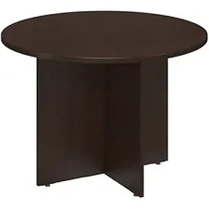 Bush Business Furniture 42W Round Conference Table in Mocha Cherry takes collaborative sophistication to a new level. Its compact footprint is perfect for conference rooms, private offices or open spaces. Finished underside prevents snagged clothing. Wide, round top fits any-size office. Wood leg base, with stable cross-member support system, includes a leveling guide for uneven floors. Continuous edge banding protects against nicks and dings from collisions. Thermally fused laminate finish resists stains and scratches. Meets ANSI/BIFMA standards for safety and performance backed by Bush Business Furniture's Limited Lifetime Warranty and is American made.
