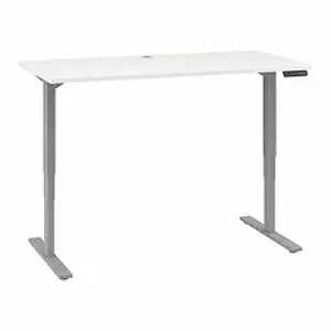 Move 80 Series Height-Adjustable Standing Desk provides a flexible, healthy and ergonomic solution for your work environment and integrates easily with other BBF products. Use as table, return or bridge. This desk accepts accessories including a keyboard tray and monitor arm. Height ranges from 24-1/2" to 50" high and operates at speed of 1-1/2" per second. It includes four programmable memory presets with a quiet, soft-touch start and stop. Thermally fused, white laminate worksurface is scratch-resistant. Cool Gray Metallic base is made of welded 16-gauge steel. Weight capacity is up to 200 lb.