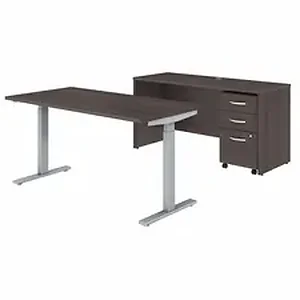 This bundle perfect for standing while you work belongs to the Studio C Collection with a wide variety of work-space solutions that are built to endure years of use in a busy professional office. Contemporary style offers proven quality and a fresh finish. Studio C is perfect for a private, home or executive office with options for expansion into multi-person work areas. It includes a height-adjustable desk (60" x 30"), credenza (60" x 24") and box/box/file pedestal. Motorized base with a 10' power cord features four programmable presets from 27" to 46.7". Thermally fused, Storm Gray laminate surfaces are scratch-resistant and stain-resistant. Clean lines and extended modesty panels provide a professional feel. Brushed nickel hardware complements the contemporary finish. Desktops include built-in wire-management grommets to maintain a neat work area.