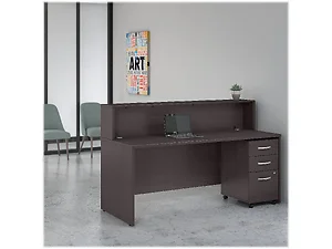 Reception Desk with a shelf and mobile pedestal gives visitors a great first impression of your organization. The bundle includes one office desk (72" wide x 30" deep), 72" reception desk shelf and a box/box/file mobile pedestal. Spacious surface with built-in wire management offers more than enough room for a productive work environment. Thermally fused laminate finish and durable edgebanding protect against everyday damage like scratches and stains while a 200 lb. capacity promises to withstand the rigors of a busy professional office. Reception Shelf extends 14" above the desktop to provide an ideal space for guests to sign in and fill out routine paperwork. Store legal, letter and A4-size documents in the filing cabinet's lower drawer and use the two box drawers to organize miscellaneous supplies. A single lock secures the two bottom drawers to protect sensitive files and personal items.