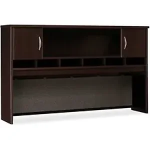 Create a complete workstation by adding this two-door hutch in Mocha Cherry for classic styling with clean lines. Mount the hutch to the Bush Business Furniture Series C 72" Desk or Credenza Shell, Corner Modules and combined Lateral Files. The hutch is constructed with durable laminate for strength and long-term use. Design includes a central open storage, six work-in-progress shelves and two closed storage compartments with self-closing, Euro-style hinges for a soft close. Wire-management grommets provide pathways to keep plugs and cables under control. Enjoy a fully finished back panel with a fabric-covered tackboard to create additional space for organizational notes and calendars. Hutch accepts two Bush Business Furniture Task Lights (sold separately) to enhance illumination and is also compatible with the Series C Elite Collection for a cohesive style.