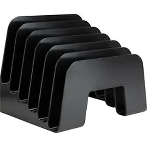 Desk Step Sorter keeps files visible and within reach. Six inclined slots hold envelopes, invoices, small notepads and more. Sorter is made of durable plastic with recycled content.