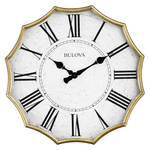 The Bulova Victorian Wall Clock is a stunning addition to any home décor. This exquisite timepiece features a scalloped-edged metal case, elegantly finished in antique gold. The large aged-white dial is easily readable, adorned with traditional Roman numerals and refined spade hands, making it a perfect blend of style and functionality. Protected by a glass lens, this quartz movement clock is not only beautiful but also reliable. It operates on a single AA battery (not included), ensuring you can enjoy its elegance without the fuss of traditional winding.