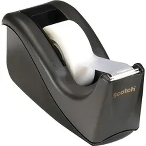 Desktop tape dispenser features a sleek, wave design. Attached tape hub cannot get lost. Heavily weighted nonskid base allows easy, one-handed dispensing. Dispenser holds 1/2" or 3/4" wide tape on a 1" core up to 1500" long.