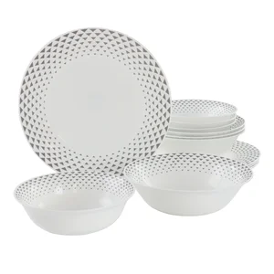 Enhance your dining experience with the Gibson Cane Peak 12-Piece Opal Glass Dinnerware Set. Perfectly designed to serve up to four guests, this set includes four fruit bowls, cereal bowls, and dinner plates. Crafted from durable opal glass, these dishes are designed to be break-resistant, ensuring longevity in your kitchen.