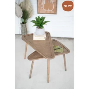 Enhance your living space with this elegant set of two wooden triangle nesting tables, featuring beautifully woven rattan tops. Perfect for adding a touch of style and functionality to any room, these tables can be used together or separately for versatile decor options.