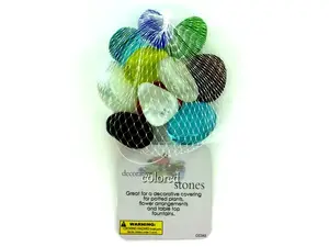 Decorative stones can be used as a decorative covering for potted plants, for flower arrangements and in table top fountains. These brightly colored stones will add nicely to any of these uses. Mesh bag includes 12 stones of various colors.