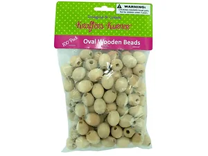 These natural oval wooden beads are perfect for a variety of crafting projects. Paint them, string them together, or glue them to create unique jewelry pieces, home decorations, and more. Each bead measures approximately 1/4" x 3/4" and features a drilled hole for easy threading. Packaged conveniently in a poly bag with a header card, this set includes 100 beads. Please note, these beads are not recommended for children under 3 years of age.