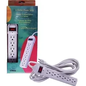 Six-outlet power strip features a built-in circuit breaker, ABS fire-retardant plastic casing, six grounded outlets, 104 joules, power switch integrated with a 15 amp overload resettable circuit breaker, mounting keyholes and an illuminated rocker switch as well as a SJT 14/3C grounded power cord. Rated at 125 volts, UL listed power strip meets CSA standards.
