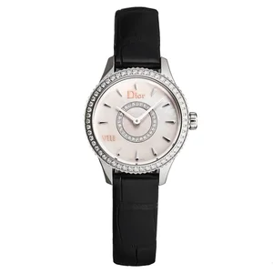 Christian Dior Women's CD151110A001 'Montaigne' Mother of Pearl Diamond Dial Diamond Bezel Leather Strap Swiss Quartz Watch Christian Dior Women's CD151110A001 'Montaigne' Mother of Pearl Diamond Dial Diamond Bezel Leather Strap Swiss Quartz Watch includes case, box, paperwork and 30 days return. The Christian Dior Women's CD151110A001 'Montaigne' Mother of Pearl Diamond Dial Diamond Bezel Leather Strap Swiss Quartz Watch features a Stainless Stee l 25mm case, with a fixed bezel, a mother of pearl set with diamonds dial and a sapphire crystal. The leather band is fitted with buckle clasp. This beautiful Christian Dior wristwatch is powered by quartz movement and has a 50 meters water resistance. Features: Brand: Christian Dior Model number: CD151110A001 Case Shape: Round Dial window material type: Sapphire Display Type: Analog Clasp: Buckle Case material: Stainless Steel Case diameter: 25 millimeters Case Thickness: 7.4 millimeters Band Material: Leather Band length: 7 inches Band Width: millimeters Band Color: Black Dial color: Mother of Pearl set with diamonds Bezel material: Stainless Steel set with diamonds Bezel function: Fixed Special Features: Silver hands color Calendar: None Movement: Quartz Water resistant depth: 50 meters UPC: 7612633135993 Christian Dior CD151110A001 MSRP: $6,550