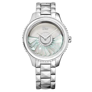 Christian Dior Women's CD153B11M001 'Grand Bal' Mother of Pearl Diamond Dial Swiss Automatic Watch The Christian Dior Women's CD153B11M001 'Grand Bal' Mother of Pearl Diamond Dial Swiss Automatic Watch features a stainless steel 36mm case, with a fixed bezel, a mother of pearl dial and a sapphire crystal . The stainless steel band is fitted with a deployment clasp. This beautiful wristwatch is powered by automatic movement. This watch has a water resistance of up to 50 meters, suitable for short periods of recreational swimming, but not diving or snorkeling. Features: Brand: Christian Dior Model number: CD153B11M001 Dial Shape: Round Dial window material type: Sapphire Display Type: Analog Case material: Stainless steel Clasp: Deployment Case diameter: 36 millimeters Case Thickness: 11.5 millimeters Band Material: Stainless Steel Band length: 7 inches Band width: 16 millimeters Band Color: Silver tone Dial color: Mother of Pearl Bezel material: Stainless steel Bezel function: Fixed Special features: Diamonds: 32 / Carat (approx.): 0.08 Movement: Automatic Water resistant depth: 50 meters/165 feet UPC: 7612633133173 Christian Dior CD153B11M001 MSRP: $16,600
