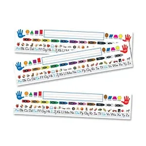 Desk nameplates are an excellent way to assign seats while also providing students with a helpful reference resource. Each pack includes 30 self-adhesive nameplates, measuring 18" x 4" each. Each nameplate showcases shapes and their names; colors and their names; alphabet with uppercase and lowercase letters; and left/right hands. Students can write their name in the space provided. Nameplates also feature Quick Stick lines so you no longer need tape, staples, or pushpins. The Quick Stick lines are self-adhesive, sticking to most smooth surfaces like wood, metal, and even painted cinder blocks. Nameplates come down as easily as they go up and without damaging your walls. They can also be repositioned over and over again.